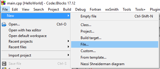 W Code::Blocks przejdź do menu Menu Plik i wybierz Nowy > Plik….