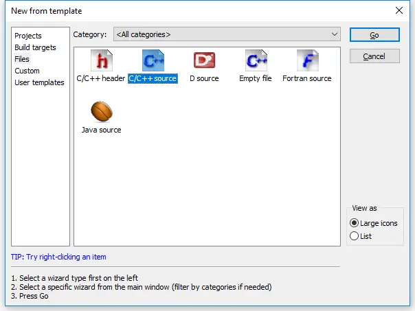 W Nowy z szablonu okno dialogowe, wybierz Źródło C/C++ i kliknij Przejdź.