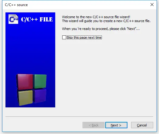 W tym momencie może pojawić się okno powitalne <<<M26>>>powitanie w kreatorze pliku źródłowego C/C++ . Jeśli tak, kliknij Dalej.