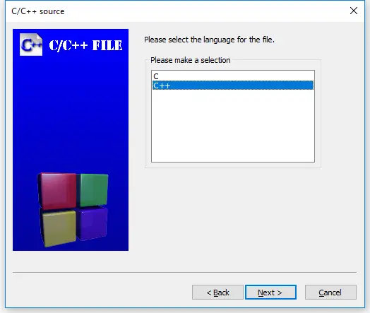 Na następnej stronie kreatora wybierz „C++” i kliknij Dalej.