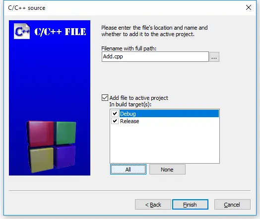 Teraz nadaj nowemu plikowi nazwę (nie zapomnij o rozszerzeniu .cpp) i kliknij przycisk Wszystkie , aby upewnić się, że wszystkie cele kompilacji zostały wybrane. Na koniec wybierz zakończ.