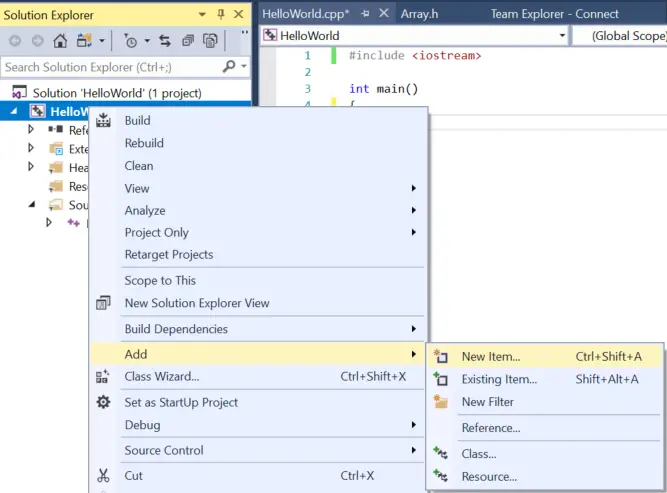 Uwaga: Jeśli utworzysz nowy plik z menu Menu Plik zamiast z projektu w Eksploratorze rozwiązań, nowy plik nie zostanie automatycznie dodany do projektu. Będziesz musiał dodać go do projektu ręcznie. Aby to zrobić, kliknij prawym przyciskiem Source Files w klasie Eksplorator rozwiązań, wybierz Dodaj > Istniejący element, a następnie wybierz swój plik.