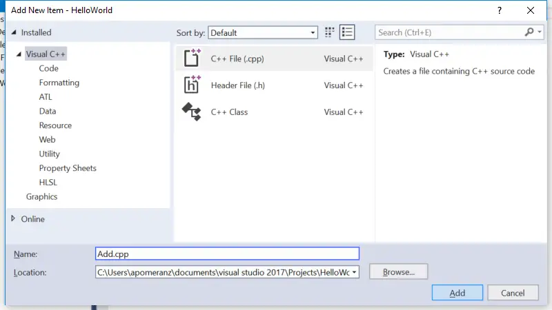 Upewnij się, że masz Plik C++ (.cpp) wybrano. Nadaj nowemu plikowi nazwę, a zostanie on dodany do Twojego projektu.