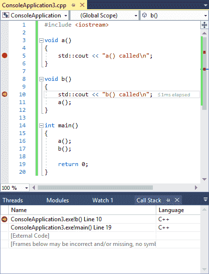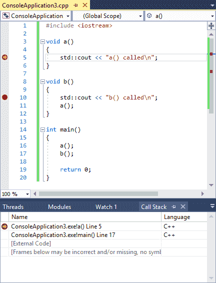 }Umieść punkty przerwania w liniach 5 i 10 tego programu, a następnie rozpocznij tryb debugowania. Ponieważ funkcja a jest wywoływana jako pierwsza, jako pierwszy zostanie trafiony punkt przerwania w linii 5.