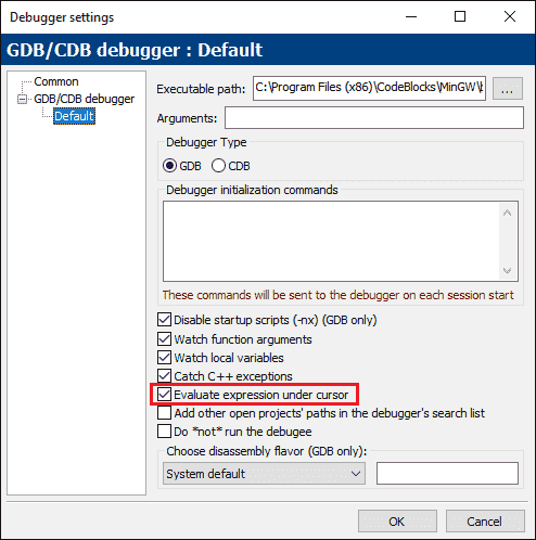 Jeśli używasz Code::Blocks, ta opcja jest (w niewytłumaczalny sposób) domyślnie wyłączona. Włączmy to. Najpierw udaj się do menu Ustawienia > Debuger…. Następnie w węźle Debugger GDB/CDB wybierz profil Domyślny . Na koniec zaznacz pole Oceń wyrażenie pod kursorem.