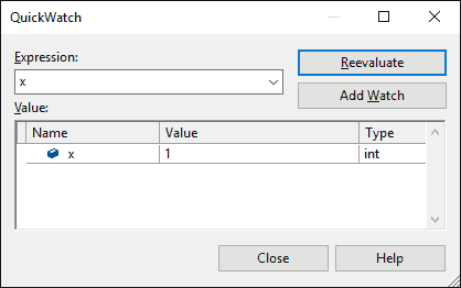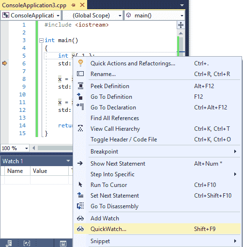 Jeśli używasz Visual Studio, możesz także użyć QuickWatch. Podświetl nazwę zmiennej x za pomocą myszy, a następnie wybierz „QuickWatch” z menu wyświetlanego po kliknięciu prawym przyciskiem myszy.