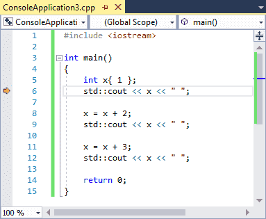 Teraz przekroczenie dwa razy lub uruchom do kursor do linii 12 i powinieneś zobaczyć wartość x zmiana z 3 Do 6.