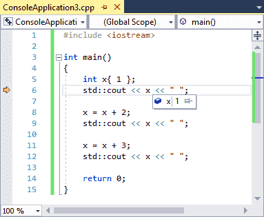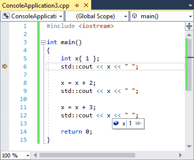 Najedź kursorem myszy na zmienną x w linii 6, a powinieneś zobaczyć coś takiego: