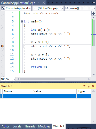 Na przykład ustawienie takiego punktu przerwania na zmiennej x w powyższym programie spowoduje zatrzymanie debugera po wykonaniu linii 8 i 11 (w tym miejscu zmienia się wartość x ).