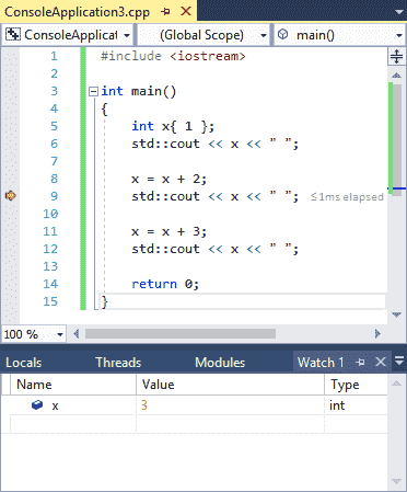 Przyjrzyjmy się teraz zmianie tej zmiennej podczas wykonywania kolejnych czynności w programie. Wybierz przekroczenie dwa razy lub uruchom do kursor do linii 9. Zmienna x powinna teraz mieć wartość 3. Sprawdź i upewnij się, że tak!